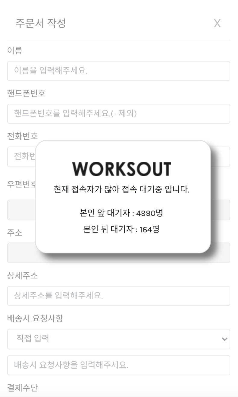 주문서 작성에도 꽤 많은 대기자가 발생하는데요, 이 역시 1~3분 정도만 기다리면 다시 활성화되기 때문에 조금만 기다렸다가 본인의 주문 정보를 기재해주세요.