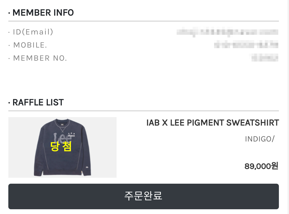 저의 경우 거의 모든 제품에 응모를 했지만 아이앱스튜디오 X 리(Lee) 피그먼트 스웨트셔츠 딱 하나만 당첨되었어요. 당첨 제품 하단의 '주문하기' 버튼을 누르면 결제할 수 있는 창이 나오게 됩니다.