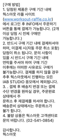 참고로 웍스아웃에서 진행하는 모든 라플 당첨 제품은 만약 구매를 진행하지 않게 되면 추후 진행되는 모든 라플 응모에서 제외돼요. 그래서 웬만하면 구매를 진행하는 걸 추천해드립니다.
