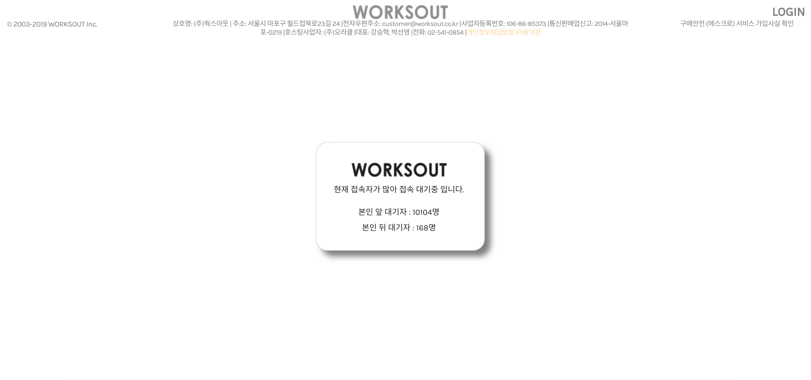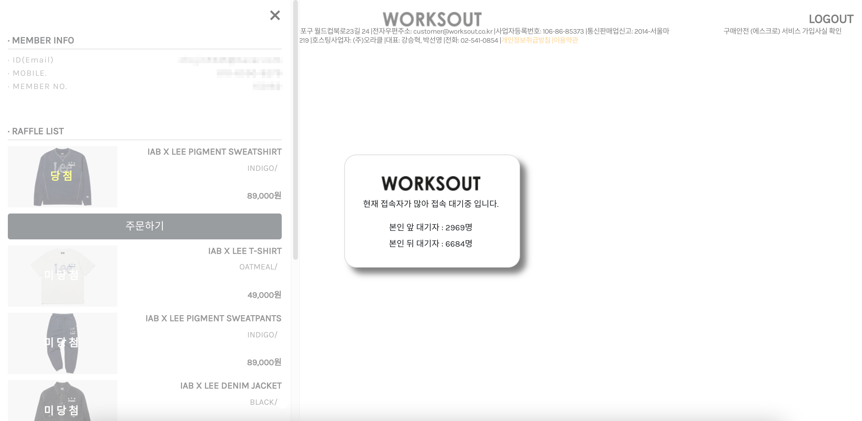 웍스아웃에서 진행한 아이앱스튜디오 X 리(Lee) 라플 응모 당첨 문자는 12월 27일 오전 11시에 일괄 발송되었는데요, 보통 당첨 문자 발송 당일에는 사이트 방문자가 폭주하기 때문에 이렇게 접속 대기를 하는 경우가 많습니다.